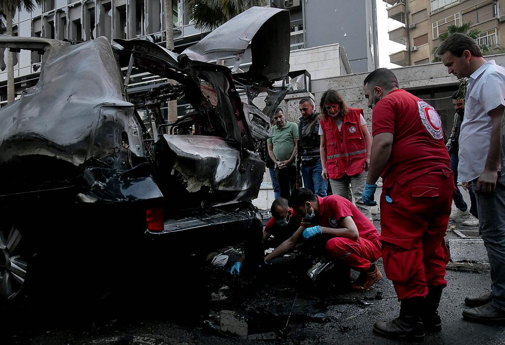 10月21日,在叙利亚首都大马士革西部迈宰地区,救援人员在遭袭汽车旁工作。叙利亚军方当日发表声明说,叙首都大马士革一辆汽车当天遭以色列空袭,造成2人死亡、3人受伤。新华社发(阿马尔·萨法尔贾拉尼摄)