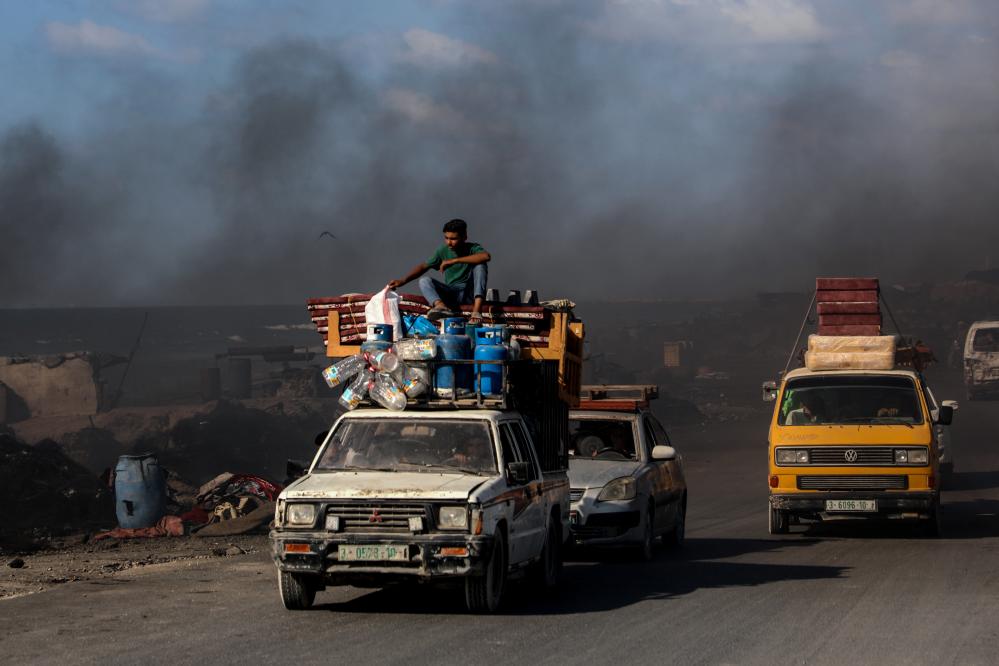 9月9日,巴勒斯坦民众携带物品乘车从加沙地带北部向南部撤离。新华社发(里泽克·阿卜杜勒贾瓦德摄)
