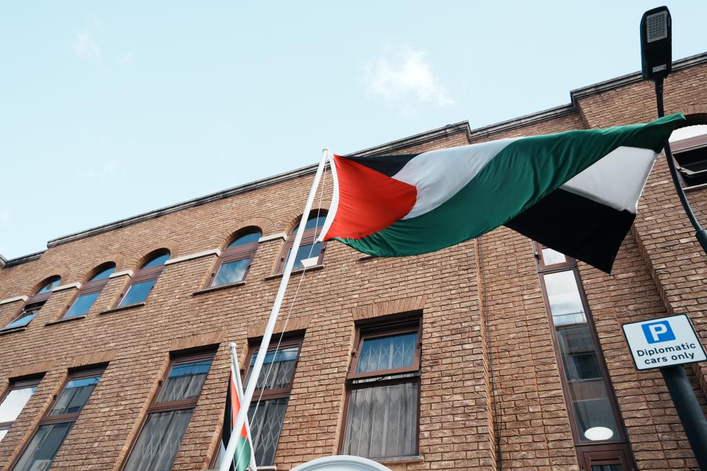 9月22日,巴勒斯坦驻英国代表处在其伦敦办公区外升起巴勒斯坦国国旗。新华社记者 赵家淞 摄