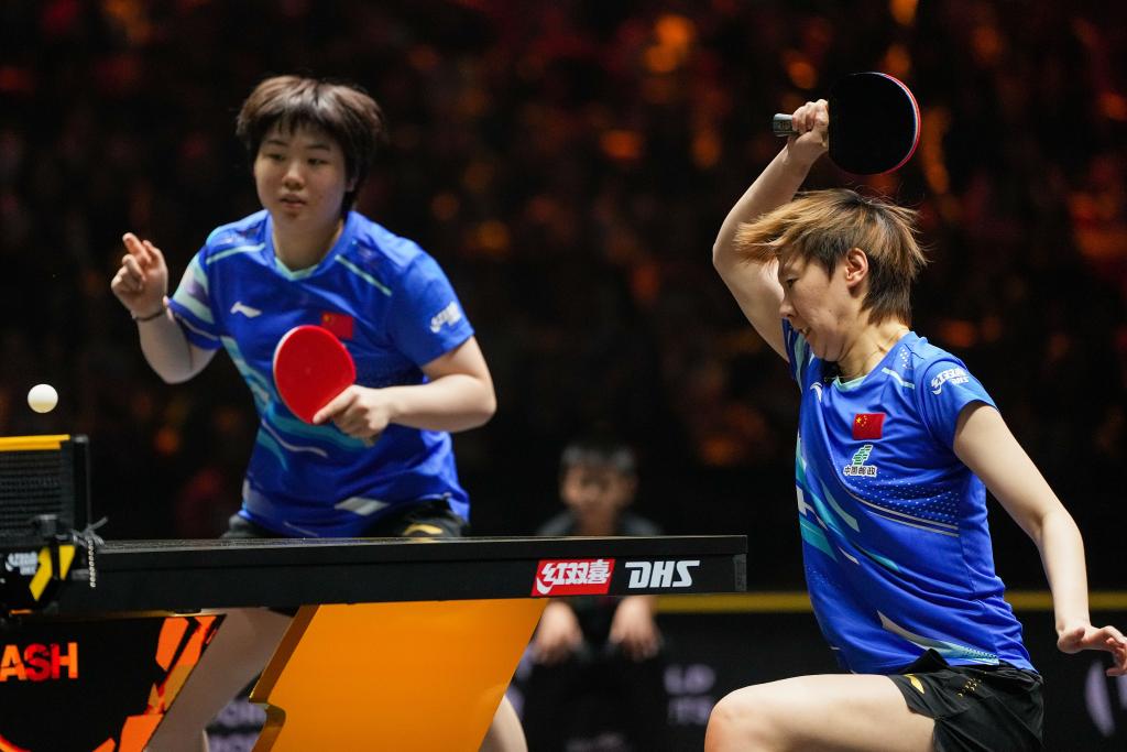 当日率先进行的女双决赛中,头号种子王曼昱/蒯曼开局以1:9落后于日本与韩国的跨协会组合早田希娜/朱芊曦,并以6:11输掉第一局。中国队组合随后迅速进行调整,以11:8、13:11、12:10连扳三局夺冠。