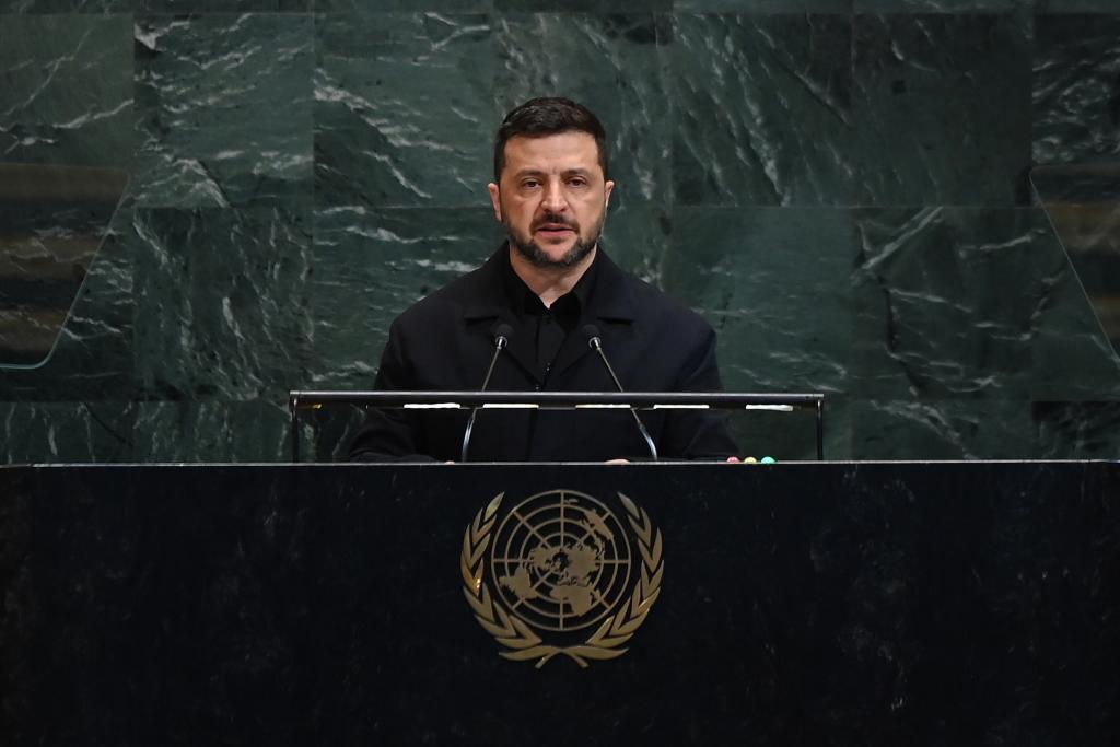 9月24日,在位于纽约的联合国总部,乌克兰总统泽连斯基在第80届联合国大会一般性辩论上发言。新华社记者李睿摄