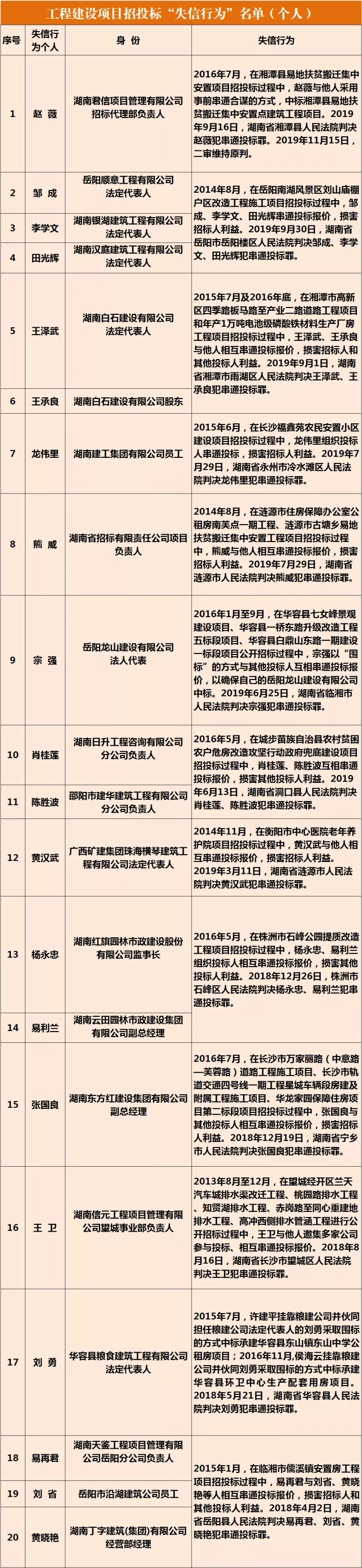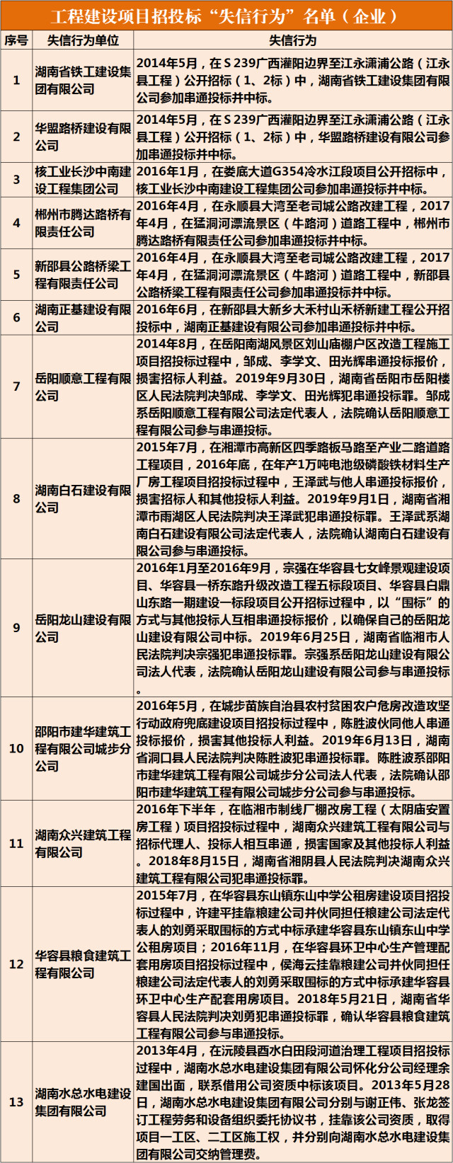 根据省委省政府部署,今年省公共资源交易管理委员会和省纪委监委组织开展工程建设项目招投标突出问题专项整治。为加大对失信违法行为的惩戒力度,规范市场主体的从业行为,现将湖南省铁工建设集团有限公司等13家企业、赵薇等36名个人列入工程建设项目招投标突出问题专项整治第一批失信行为“黑名单”并予以通报。通报名单中的企业和个人,为了谋取自身利益,有的相互串通投标报价围标串标,有的以行贿方式获取工程项目,有的出借或者挂靠资质,有的中标后将工程项目转包、违法分包。这些违法违规行为,严重损害守法经营者利益,扰乱市场竞争秩序,破坏营商环境,败坏社会风气,影响经济社会健康发展。对这些企业和个人,必须严格按照有关规定实行联合惩戒,在惩戒期限内(自发布之日起一年内)限制其从事招投标活动,取消享受财政补贴资格,强化税收监控管理,提高贷款利率,让失信违法者“一处违法、处处受限”,付出应有的代价。