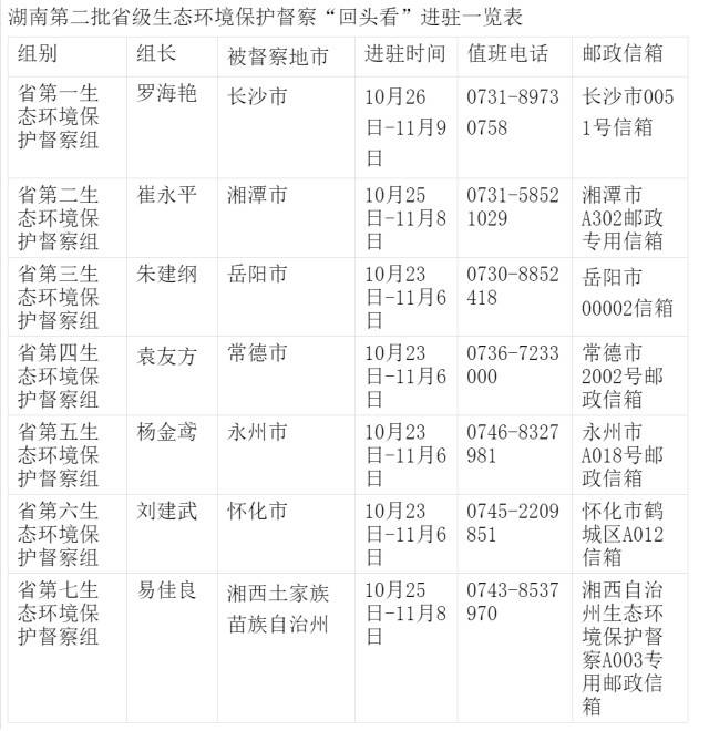 湖南日报·新湖南客户端10月26日讯(记者 曹娴)在9月中旬开展第一批省级生态环境保护督察“回头看”的基础上,第二批7个“回头看”督察组今天全部开启进驻督察。