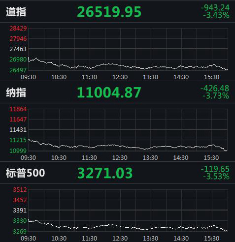 截至收盘,道琼斯工业指数跌943.24点,跌幅3.43%,报26519.95点;纳指跌426.48点,跌幅3.73%,报11004.87点;标普500指数跌119.65点,跌幅3.53%,报3271.03点。