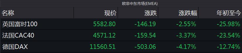 欧洲股市方面,欧洲三大股指大幅下跌,英国富时100指数报5582.80点,跌146.19点,跌幅2.55%;法国CAC40指数报4571.12点,跌159.54点,跌幅3.37%;德国DAX指数报11560.51点,跌503.06点,跌幅4.17%。