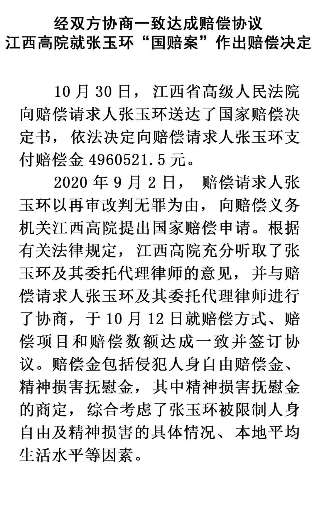 今天(30日)上午,江西省高级人民法院向赔偿请求人张玉环送达了国家赔偿决定书,依法决定向赔偿请求人张玉环支付赔偿金4960521.5元。