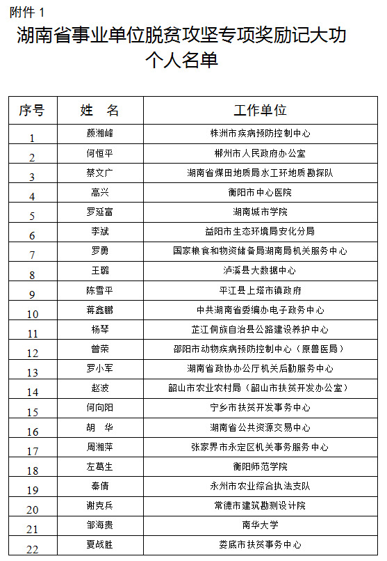 根据《事业单位工作人员奖励规定》和《湖南省人力资源和社会保障厅、湖南省扶贫开发办公室关于在全省事业单位集中开展脱贫攻坚专项奖励的通知》(湘人社函〔2020〕141号)要求,按照公开、公平、公正的原则,经逐级推荐、评选,并经省人社厅、省扶贫办审定,拟决定给予颜湘峰等22位同志、湖南省食用菌研究所等10家单位记大功奖励。