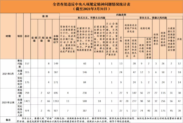 湖南省纪委监委深入贯彻中央纪委国家监委工作部署,在全省各地各部门各单位建立了落实中央八项规定精神情况月报制度。2021年以来,截至3月31日,全省查处违反中央八项规定精神问题情况如下: