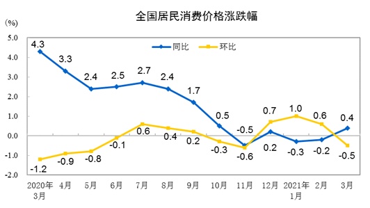 2021年3月份,全国居民消费价格同比上涨0.4%。其中,城市上涨0.5%,农村上涨0.4%;食品价格下降0.7%,非食品价格上涨0.7%;消费品价格上涨0.6%,服务价格上涨0.2%。一季度,全国居民消费价格与去年同期持平。