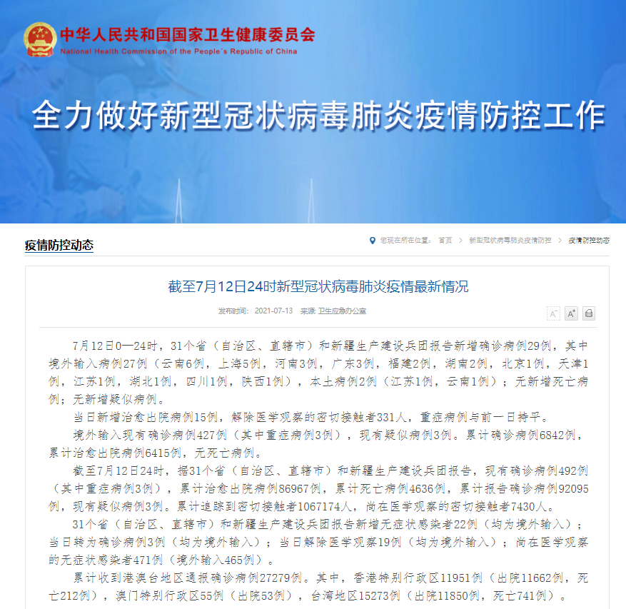 截至7月12日24时新型冠状病毒肺炎疫情最新情况