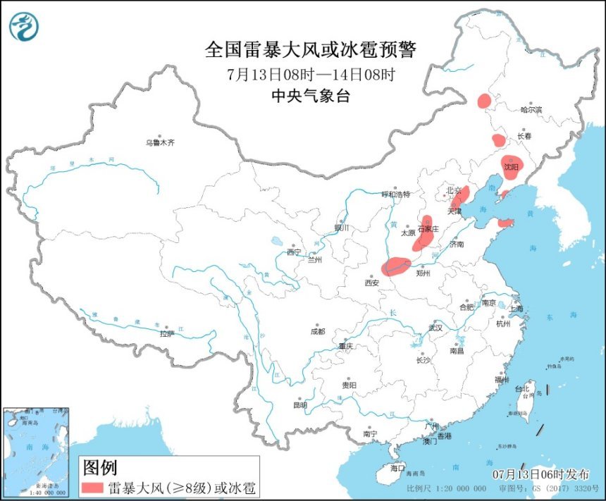 中央气象台7月13日06时继续发布强对流天气蓝色预警:
