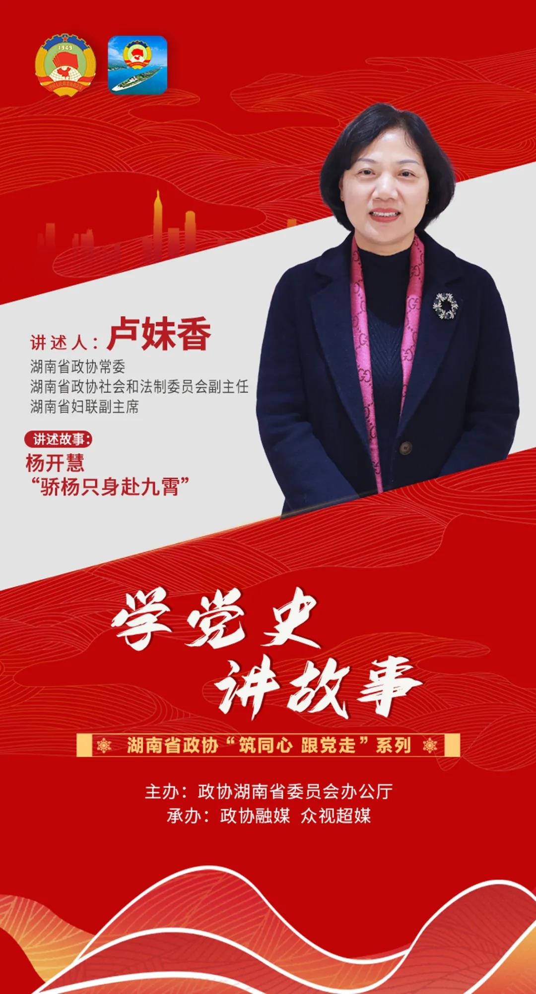 3.政协云发布“学党史·讲故事”视频:《卢妹香:杨开慧“骄杨只身赴九霄”》。详情