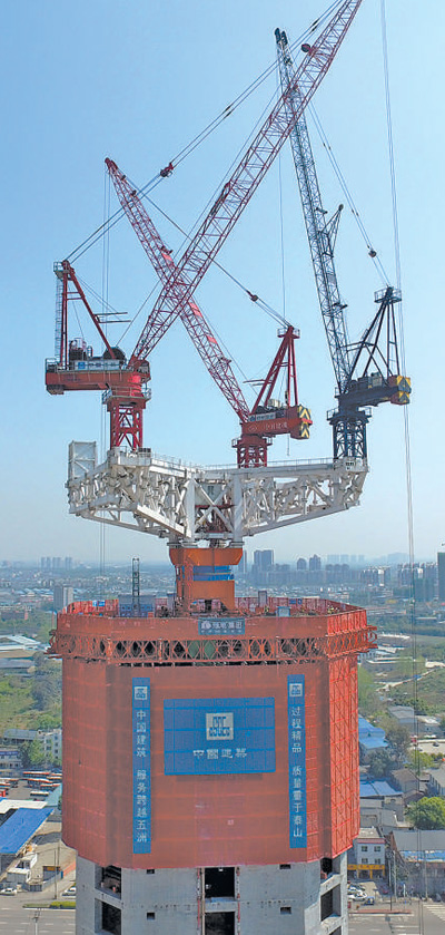中建三局自主研发的“空中造楼机”在成都绿地蜀峰项目施工作业中。该造楼机曾创下“三天一层楼”的中国速度,顶升力超4000吨,能让建筑施工在数百米高平稳进行。中建“空中造楼机”已应用于北京中信大厦、武汉绿地中心、沈阳宝能环球金融中心等项目。