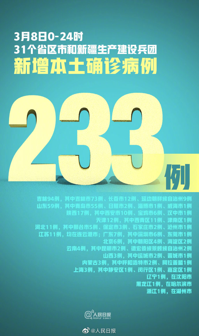 3月8日0—24时,31个省(自治区、直辖市)和新疆生产建设兵团报告新增确诊病例337例。其中境外输入病例104例(广东39例,上海26例,四川13例,甘肃7例,广西6例,北京5例,江苏3例,福建2例,山东2例,云南1例),含13例由无症状感染者转为确诊病例(广东8例,四川5例);本土病例233例(吉林94例,其中吉林市73例、长春市12例、延边朝鲜族自治州9例;山东59例,其中青岛市55例、日照市2例、淄博市1例、威海市1例;陕西17例,其中西安市10例、宝鸡市6例、汉中市1例;天津12例,其中西青区11例、津南区1例;河北11例,其中邢台市5例、保定市3例、石家庄市2例、沧州市1例;江苏11例,均在连云港市;广东7例,其中深圳市6例、东莞市1例;北京6例,其中朝阳区4例、海淀区2例;云南4例,其中昆明市2例、德宏傣族景颇族自治州2例;山西3例,其中运城市2例、晋城市1例;内蒙古3例,其中呼和浩特市2例、阿拉善盟1例;上海3例,其中静安区1例、闵行区1例、嘉定区1例;辽宁1例,在沈阳市;黑龙江1例,在哈尔滨市;浙江1例,在湖州市),含13例由无症状感染者转为确诊病例(山东9例,山西2例,辽宁1例,广东1例)。无新增死亡病例。新增疑似病例15例,均为境外输入病例(均在上海)。