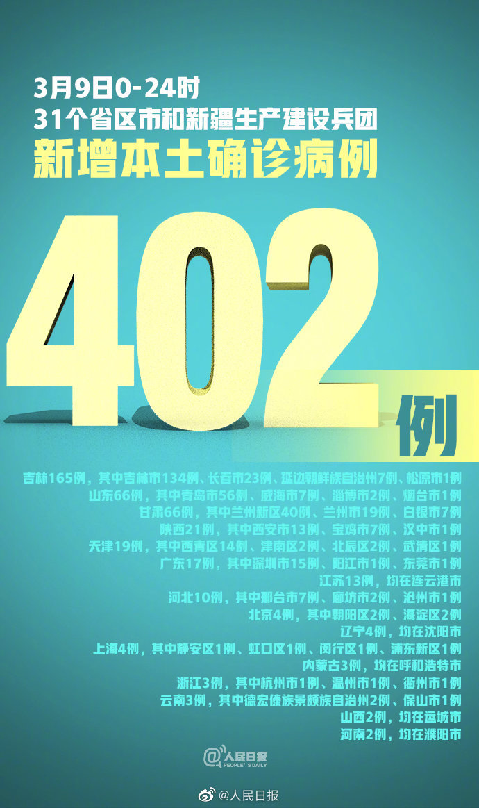 3月9日0—24时,31个省(自治区、直辖市)和新疆生产建设兵团报告新增确诊病例528例。其中境外输入病例126例(上海42例,广东33例,北京14例,广西12例,河南7例,四川4例,甘肃4例,黑龙江3例,浙江3例,云南2例,江苏1例,福建1例),含17例由无症状感染者转为确诊病例(广东5例,北京4例,浙江3例,四川3例,河南2例);本土病例402例(吉林165例,其中吉林市134例、长春市23例、延边朝鲜族自治州7例、松原市1例;山东66例,其中青岛市56例、威海市7例、淄博市2例、烟台市1例;甘肃66例,其中兰州新区40例、兰州市19例、白银市7例;陕西21例,其中西安市13例、宝鸡市7例、汉中市1例;天津19例,其中西青区14例、津南区2例、北辰区2例、武清区1例;广东17例,其中深圳市15例、阳江市1例、东莞市1例;江苏13例,均在连云港市;河北10例,其中邢台市7例、廊坊市2例、沧州市1例;北京4例,其中朝阳区2例、海淀区2例;辽宁4例,均在沈阳市;上海4例,其中静安区1例、虹口区1例、闵行区1例、浦东新区1例;内蒙古3例,均在呼和浩特市;浙江3例,其中杭州市1例、温州市1例、衢州市1例;云南3例,其中德宏傣族景颇族自治州2例、保山市1例;山西2例,均在运城市;河南2例,均在濮阳市),含10例由无症状感染者转为确诊病例(辽宁3例,山东3例,山西2例,吉林1例,云南1例)。无新增死亡病例。新增疑似病例10例,均为境外输入病例(均在上海)。
