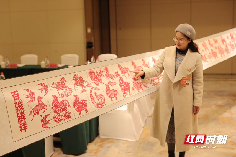 一马当先、骏逸繁花、焰蹄奔霄……你能想象,剪纸艺术能幻化出百种骏马的姿态吗?2月1日晚,在华晨豪生大酒店委员驻地会议室内,湖南省政协委员、新邵县思源实验学校教研室副主任马丽娅在现场展开了一幅长达20.26米的《百骏腾祥》剪纸长卷,为2026年湖南省两会送上了一份独具匠心的礼物。