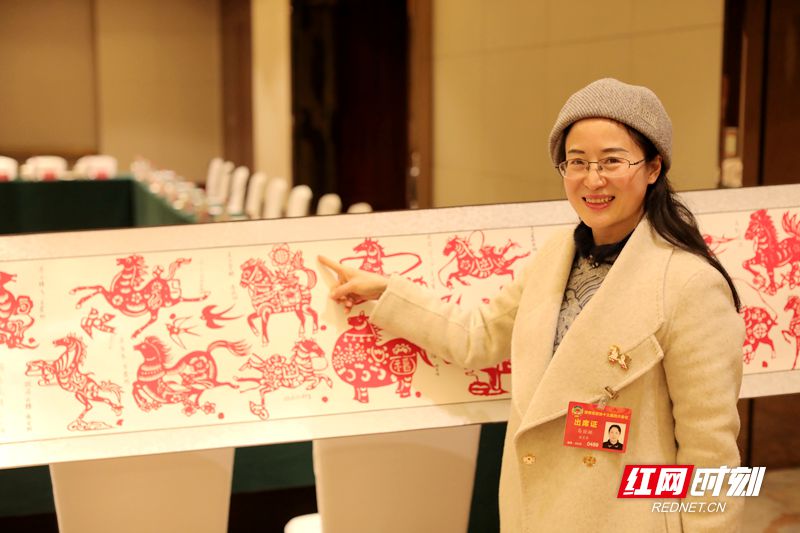 湖南省政协委员、新邵县思源实验学校教研室副主任马丽娅介绍《百骏腾祥》剪纸长卷。