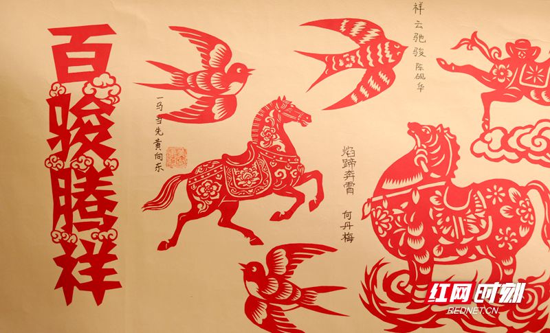 长卷之上,百匹骏马栩栩如生,有的昂首嘶鸣,鬃毛飞扬;有的悠然漫步,姿态温婉;有的腾跃而起,气势如虹。马丽娅介绍,这些形态各异的骏马,是学校200多名师生共同创作的成果,大家将湖湘非遗的匠心与新春的美好祝福,都融进了这一纸红韵里。