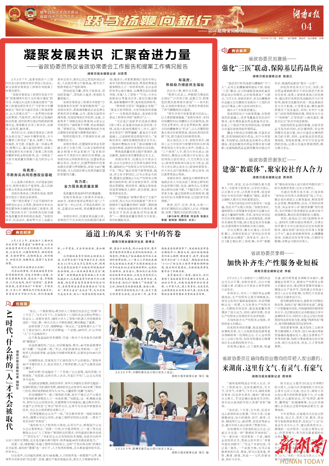 “省政协常委会工作报告发出今年要‘助推湖南年轻人友好城市建设’的号召,我建议从这些方面推动落实”“提案工作情况报告中关于‘守护青少年健康成长’等内容与基层司法工作高度契合,让人深感认同”……各界别分组审议的现场,气氛热烈,委员们以饱满的政治热情、强烈的责任意识和昂扬的精神状态,紧密联系自身工作实际,谈感受、话发展、献良策。