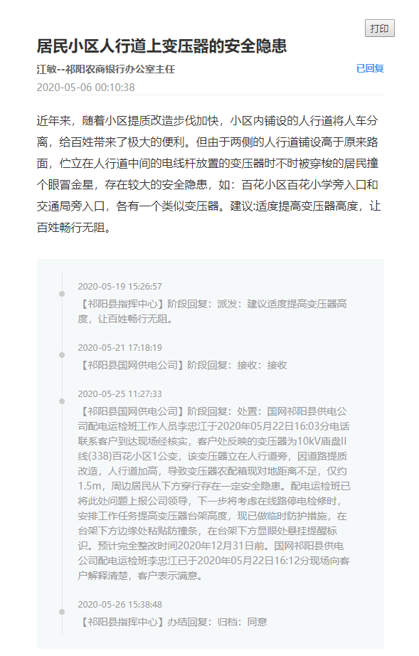5月19日,微建议得到了祁阳县指挥中心的回应——“建议适度提高变压器高度,让百姓出行无阻”,指挥中心的建议很快便收到了处理结果。