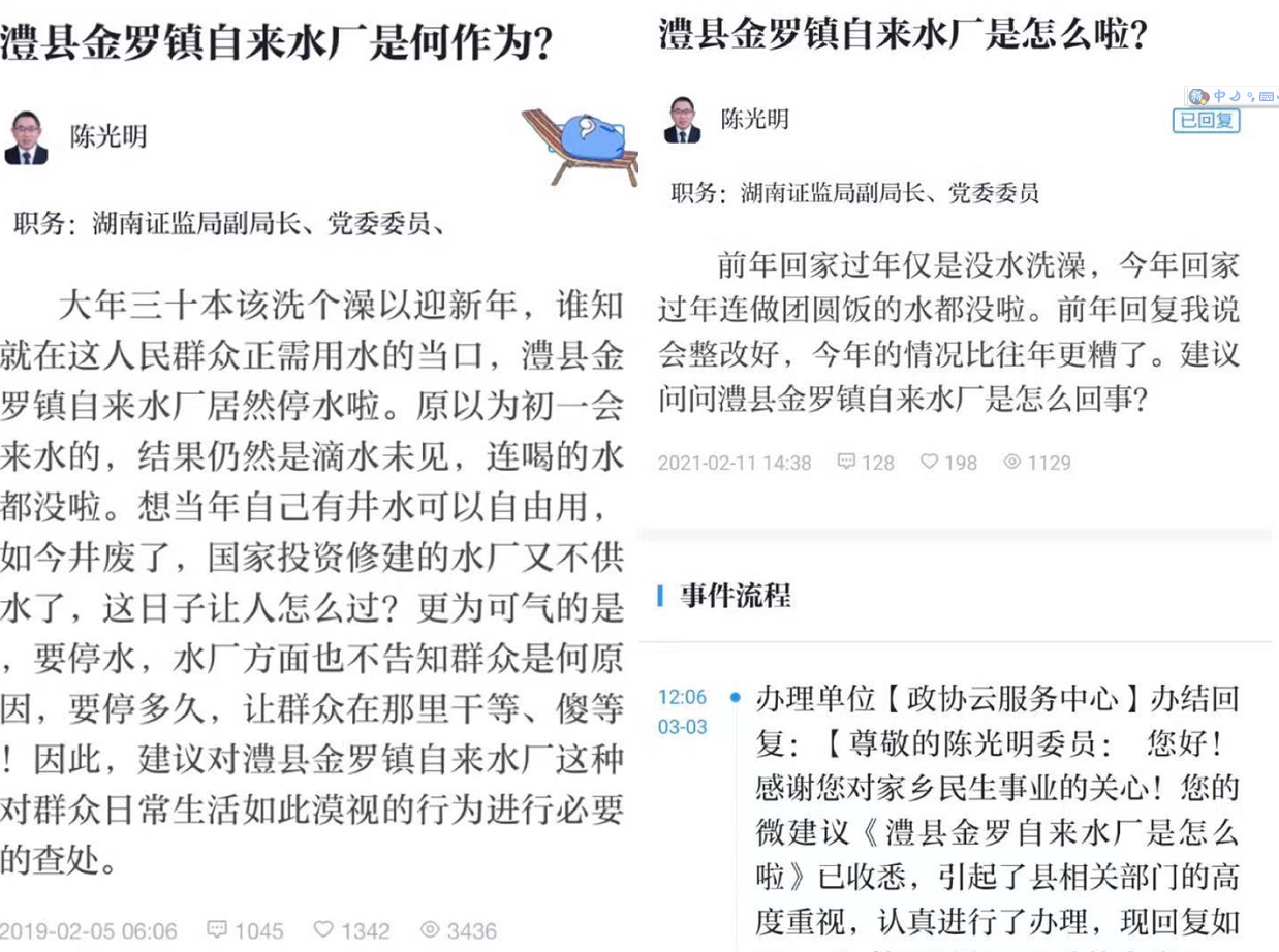 然而,在2021年春节期间,除夕夜停水的现象再次出现,自2月10日12点左右停水,15日中午才恢复正常。“前年回复我说会整改好,今年的情况比往年更糟了,建议问问澧县金罗镇自来水厂是怎么回事?”陈光明在建议中提到。