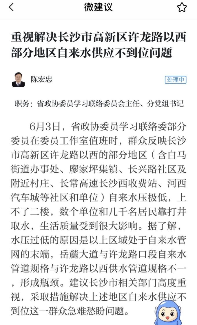 为尽快解决群众反映的难题,陈宏忠在政协云上提交了“重视解决长沙市高新区许龙路以西部分地区自来水不到位问题”的微建议,呼吁长沙市相关部门高度重视,采取措施,让片区居民、商户早日告别打井取水的日子。