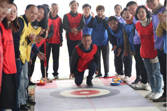 集结热身之后,大家共分成6支小队,两两进行冰壶对抗积分赛。每队的队员轮番上阵,找准目标位置、掷出冰壶,有的一把入圈,有的直接出界,还有的撞上“对手”的冰壶,竟给对方送了分。场上场下,时而欢笑声起,时而屏住呼吸。有队伍凭借实力一路大幅领先,也有队伍起初一直落后,却在最后一盘实现“绝地反杀”,大家在比赛中感受到冰壶运动的魅力。