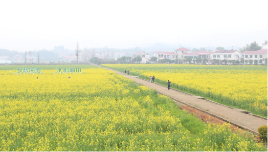 乡愁园野,水韵梅田。眼前是成片的油菜花田,与远处红顶白墙的农舍遥相映衬,身后是沿主渠道而修建的乡村振兴文化观景长廊,这是湖南省美丽乡村示范村古港镇梅田湖村所打造的松山屋场的景象。