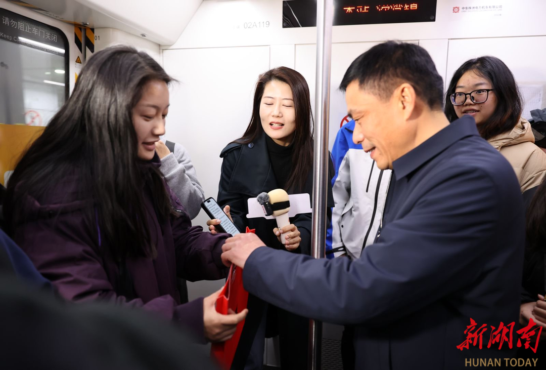 “回家过周末,没想到能在地铁里偶遇代表委员,还提前收到了新春祝福!”在深圳上班的长沙市民王先生收到新春福袋非常开心,马上举起手机扫描列车车窗上的二维码,在新湖南客户端上留下“希望家乡的营商环境越来越好,有机会能回家创业!”的美好愿望。