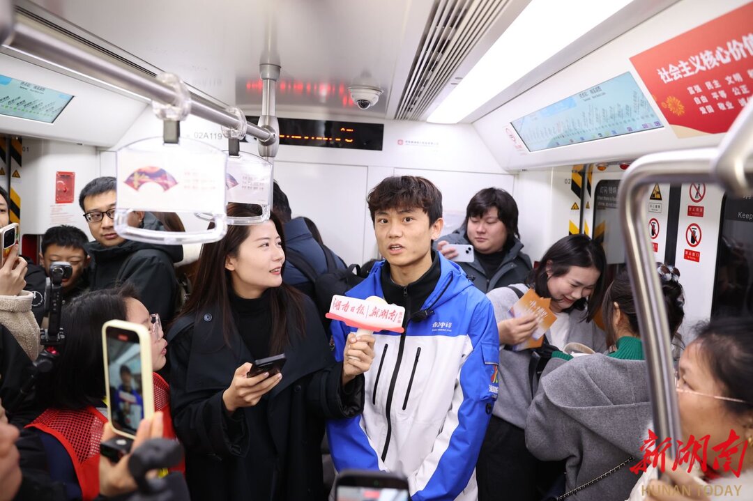 湘超永州队球员高响的出现,让车厢里的年轻乘客和小朋友们格外兴奋。这位叱咤湘超赛场的年轻人非常爽朗地告诉大家:“未来五年,希望能顺利完成大学学业,有机会继续深造。”谈到对于湘超的期待,他愿意下个五年继续为永州队效力,让更多人看到湖南人敢打敢拼、霸得蛮的精神。