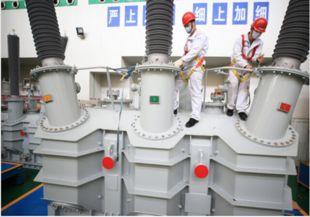 出口订单产品下线,特变电工衡变公司装配车间,工人进行下线前最后的安装调试。尹翔宇 曹正平 摄