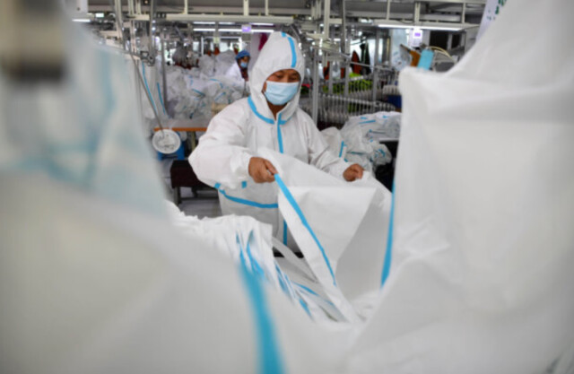 日产万件防护服出口欧美,衡阳县西渡高新技术产业园区,技术工人在加紧生产防护服。湖南日报首席记者 郭立亮 通讯员 刘欣荣 摄