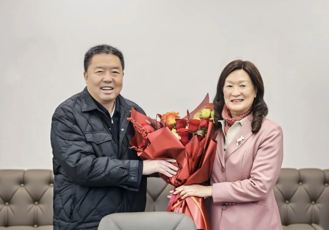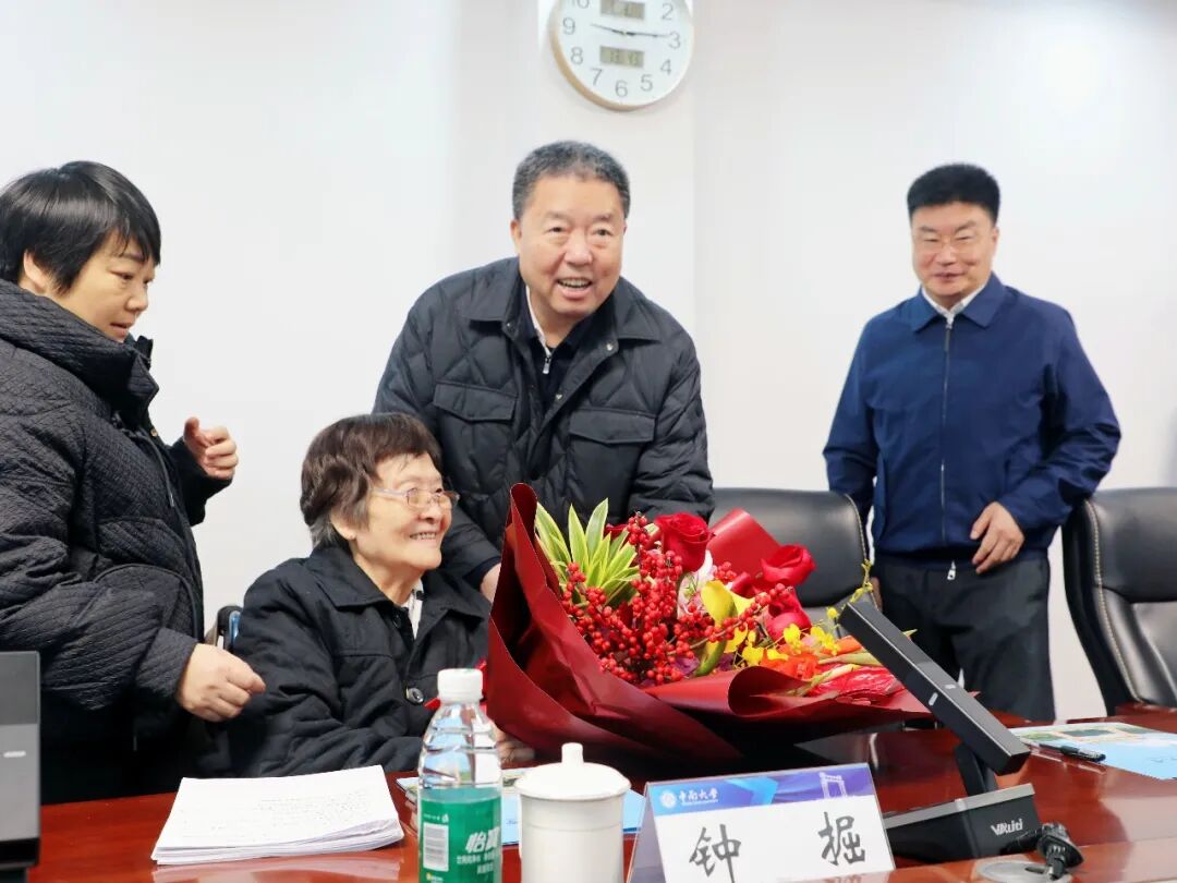 来到中南大学新校区中铝科技大楼,毛万春给钟掘院士送上鲜花,关切询问她的身体状况以及团队相关科研工作进展情况,并进行座谈交流。