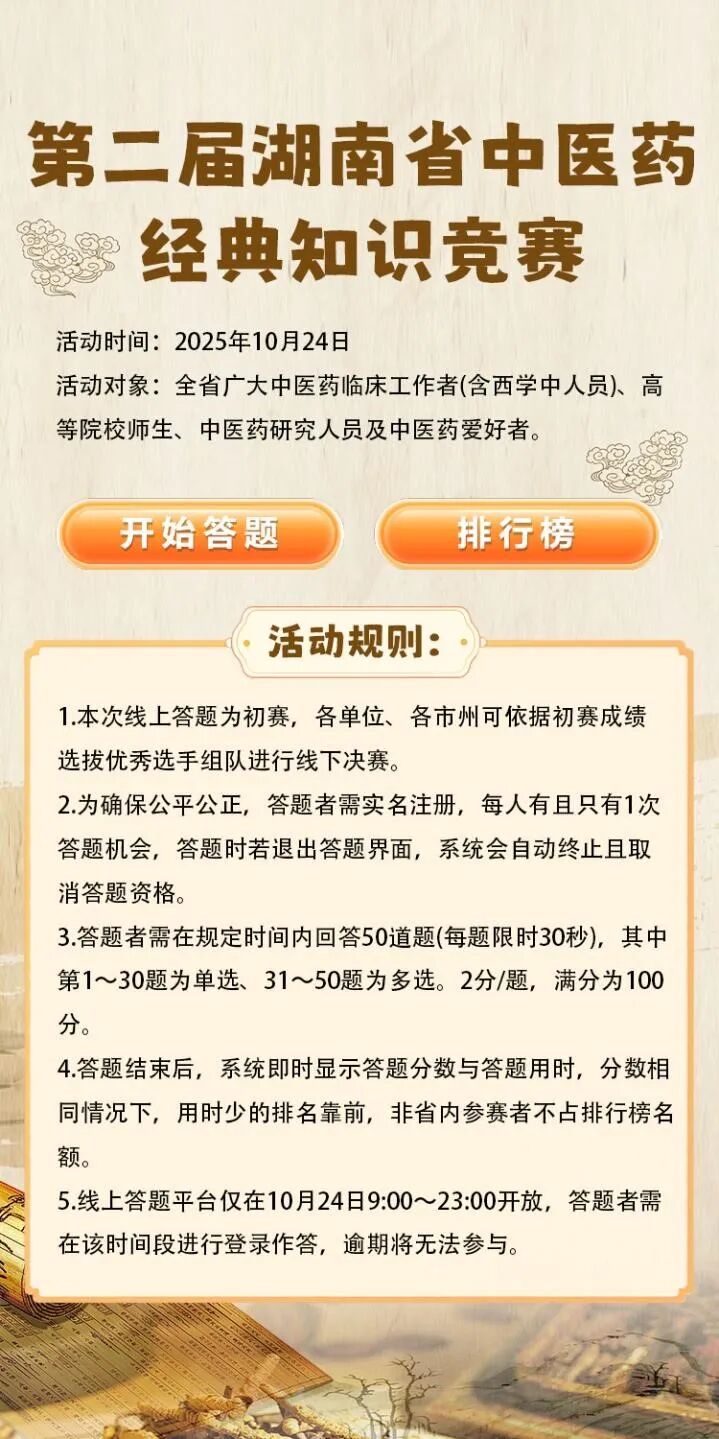 请关注“湖湘中医”订阅号,比赛当天(10月24日)输入关键词:第二届中医药经典知识竞赛,即可进入答题页面。