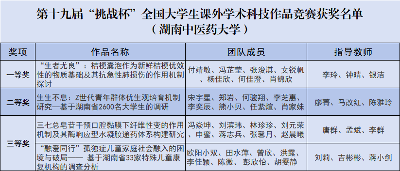 国赛主体赛一等奖作品《“生者尤良”:桔梗囊泡作为新鲜桔梗优效性的物质基础及其抗急性肺损伤的作用机制探讨》创新性聚焦药用植物囊泡这一鲜药来源的天然活性药效物质,阐述了鲜药抗急性肺损伤优效性的关键物质基础,以及桔梗囊泡在其中的具体作用机制,现已获4项国家级大学生创新项目资助,授权国家发明专利1项,团队成员以第一作者身份发表SCI论文6篇(含中国科学院一区TOP,IF=12.6)。主体赛二等奖作品《生生不息:Z世代青年群体优生观培育机制研究—基于湖南省2600名大学生的调研》旨在共同构建青年敢生、家庭愿生、社会助生的美好未来,创新性地提出了包含“经济减负、服务优化、制度保障、文化转型、自我赋能”的五维联动支持体系,获湖南省计生协等3家政府单位采纳。