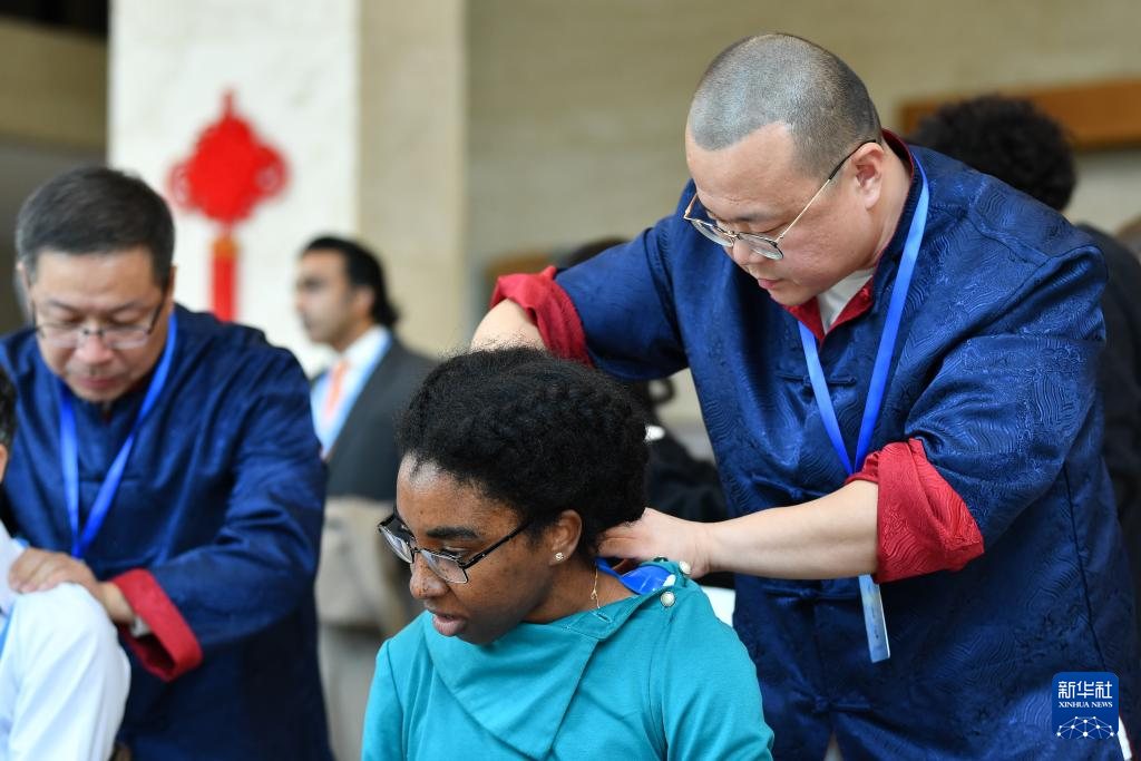 10月29日,在瑞士日内瓦万国宫,嘉宾在“中医联世界 参香满重阳——中医药走进万国宫”文化活动上体验中医按摩。新华社记者 连漪 摄