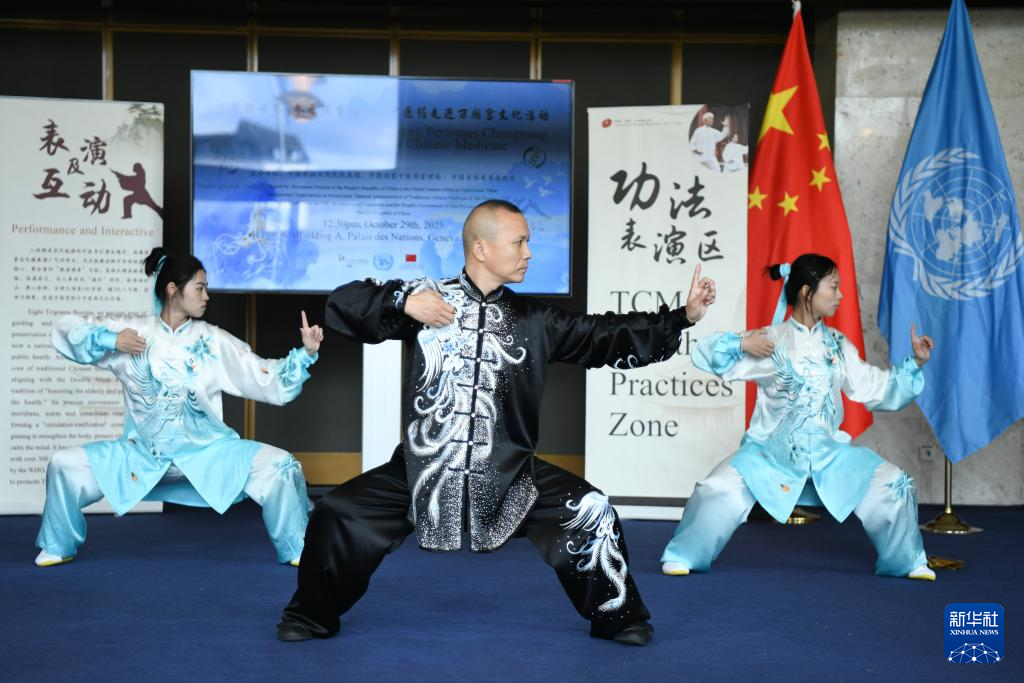 10月29日,在瑞士日内瓦万国宫,表演者在“中医联世界 参香满重阳——中医药走进万国宫”文化活动上进行功法表演。新华社记者 连漪 摄