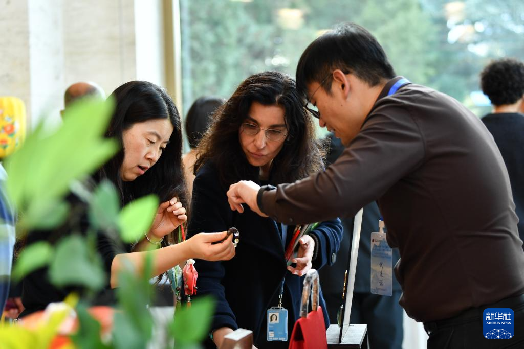 10月29日,在瑞士日内瓦万国宫,嘉宾在“中医联世界 参香满重阳——中医药走进万国宫”文化活动上了解人参香味的手串。新华社记者 连漪 摄