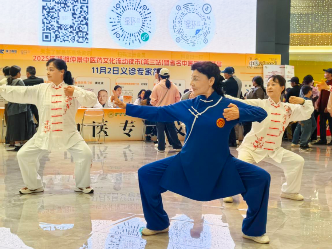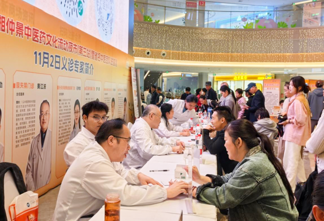 11月2日晚,2025年湖湘仲景中医药文化流动夜市第三站在长沙珠江·星环购物中心举办,名中医专家义诊区、瑶医特色体验专区、中药茶饮专区、特色膏方专区等摊位依次排开。