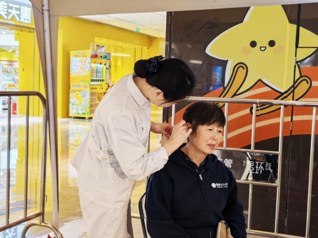 市民在中医夜市上体验“耳穴压豆”疗法。政协融媒记者 易永艳 摄