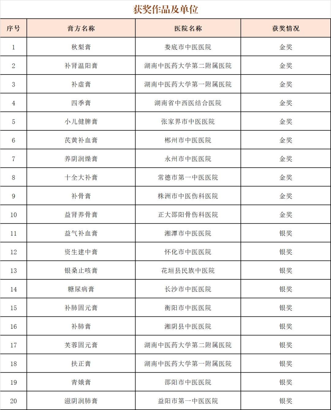 活动现场举行了首届湖南省膏方大赛颁奖仪式。本次大赛共收到全省50余件参赛作品,经专家从配方、工艺、临床效果等多维度评审,最终评选出金奖、银奖各10名。湖南中医药大学第一附属医院、湖南中医药大学第二附属医院、湖南省中西医结合医院、娄底市中医医院、永州市中医医院等机构荣获金奖。