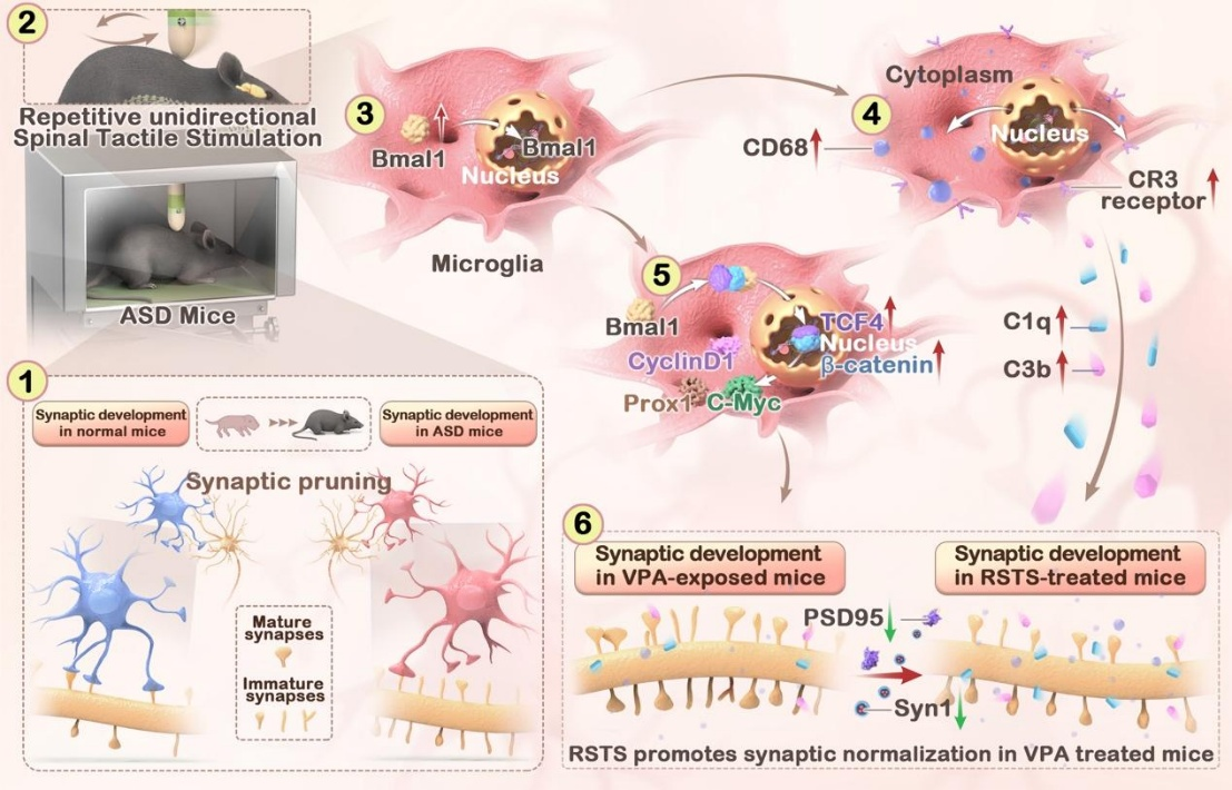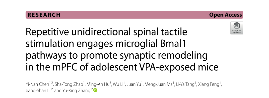 我校推拿学科在神经科学领域权威期刊《Journal of Neuroinflammation》(中科院一区,IF:10.1)发表题为“Repetitive unidirectional spinal tactile stimulation engages microglial Bmal1 pathways to promote synaptic remodeling in the mPFC of adolescent VPA-exposed mice”的最新研究成果,研究揭示了督脉推法(RSTS)在改善孤独症样行为中的关键作用及潜在分子机制,证实督脉推法可通过增强青少年时期小鼠内侧前额叶皮层(mPFC)中小胶质细胞突触修剪功能发挥效应,并明确了核心昼夜节律蛋白Bmal1在这一过程中的调控作用,为孤独症谱系障碍的非药物干预提供了全新的科学依据。