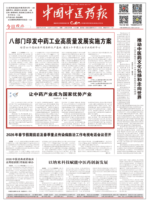 近日,工业和信息化部等八部门联合印发《中药工业高质量发展实施方案(2026—2030年)》,对“十五五”时期中药工业发展作出具体部署,体现了中央对中药产业发展的高度重视和支持,也必将为未来中药产业成为国家优势产业奠定坚实基础。