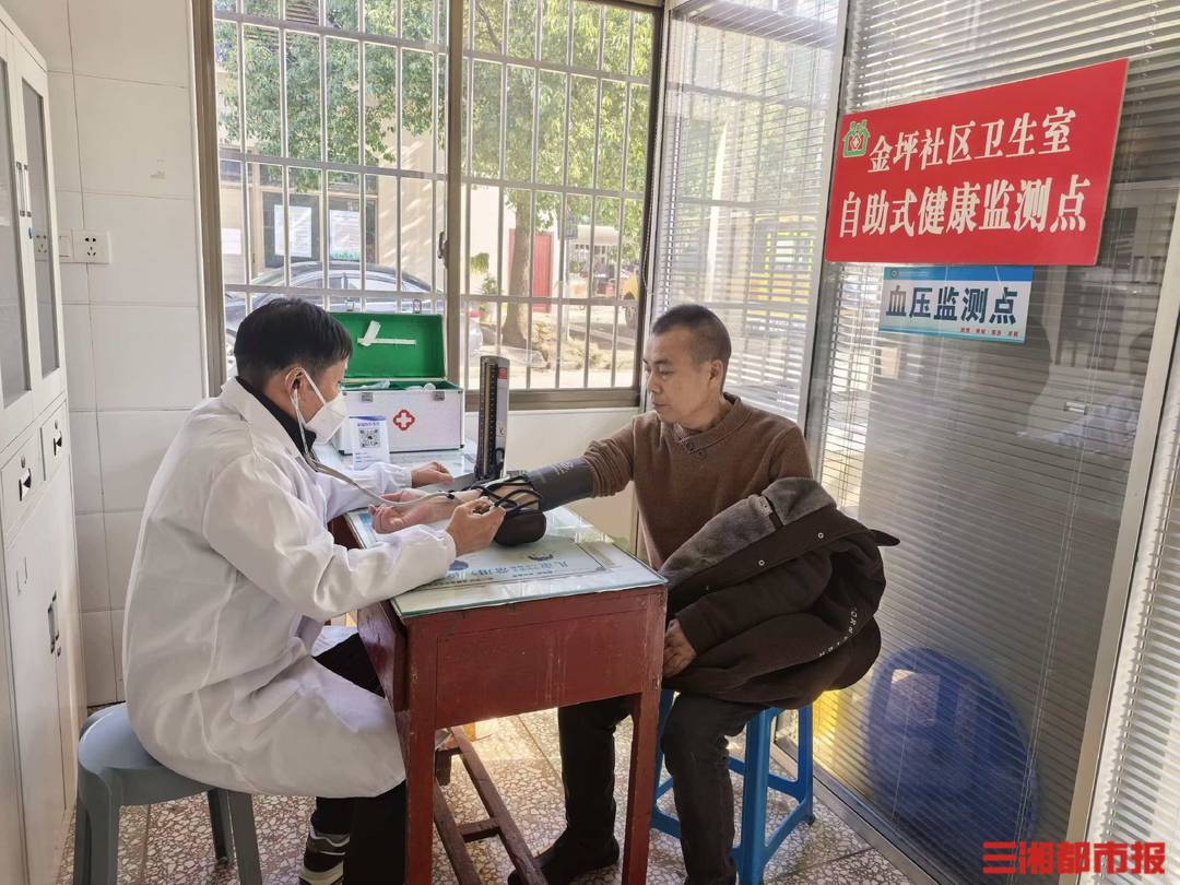 图说:湖南湘江新区金坪社区卫生室,村医在为居民测量血压。高煜棋摄