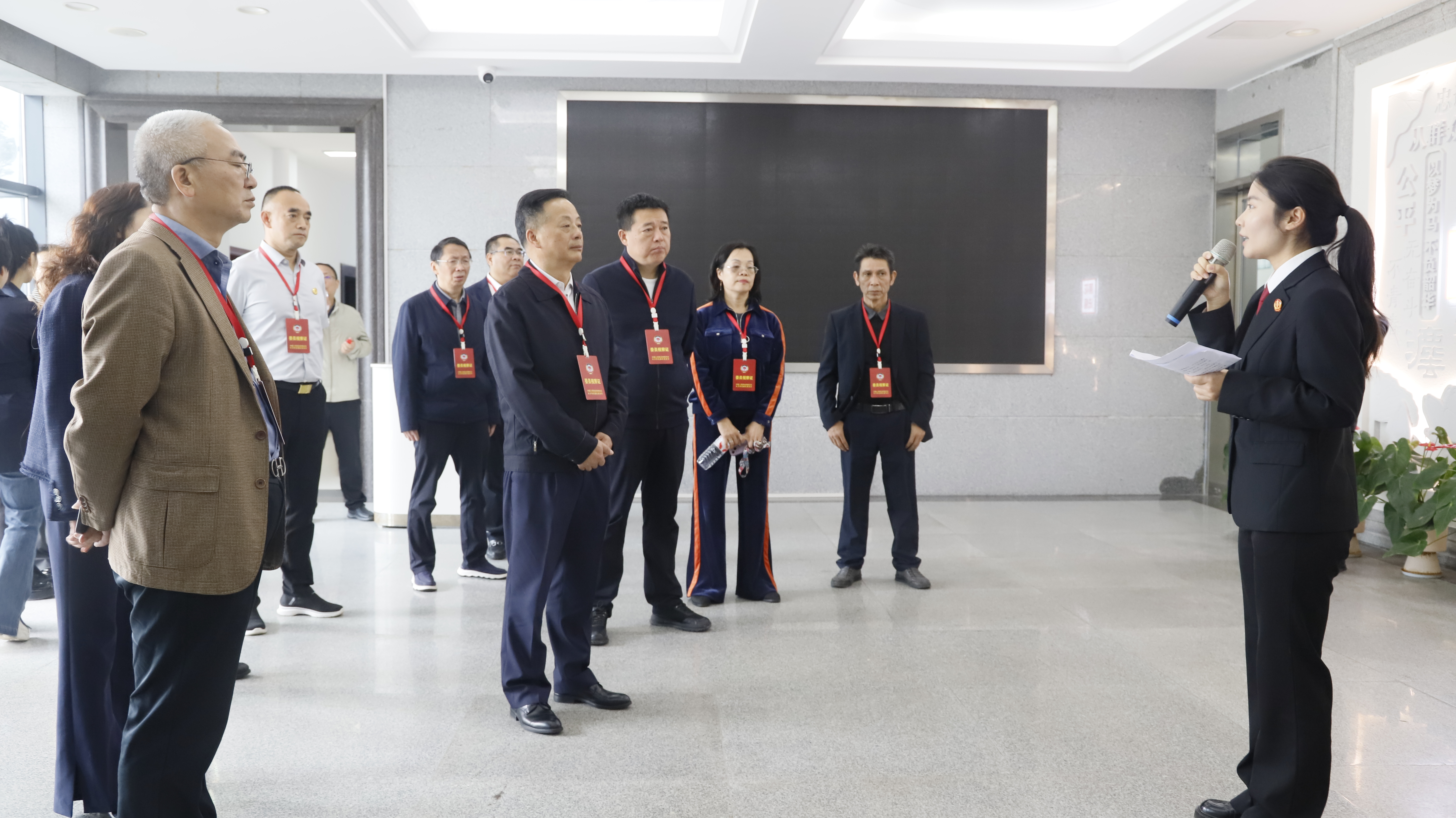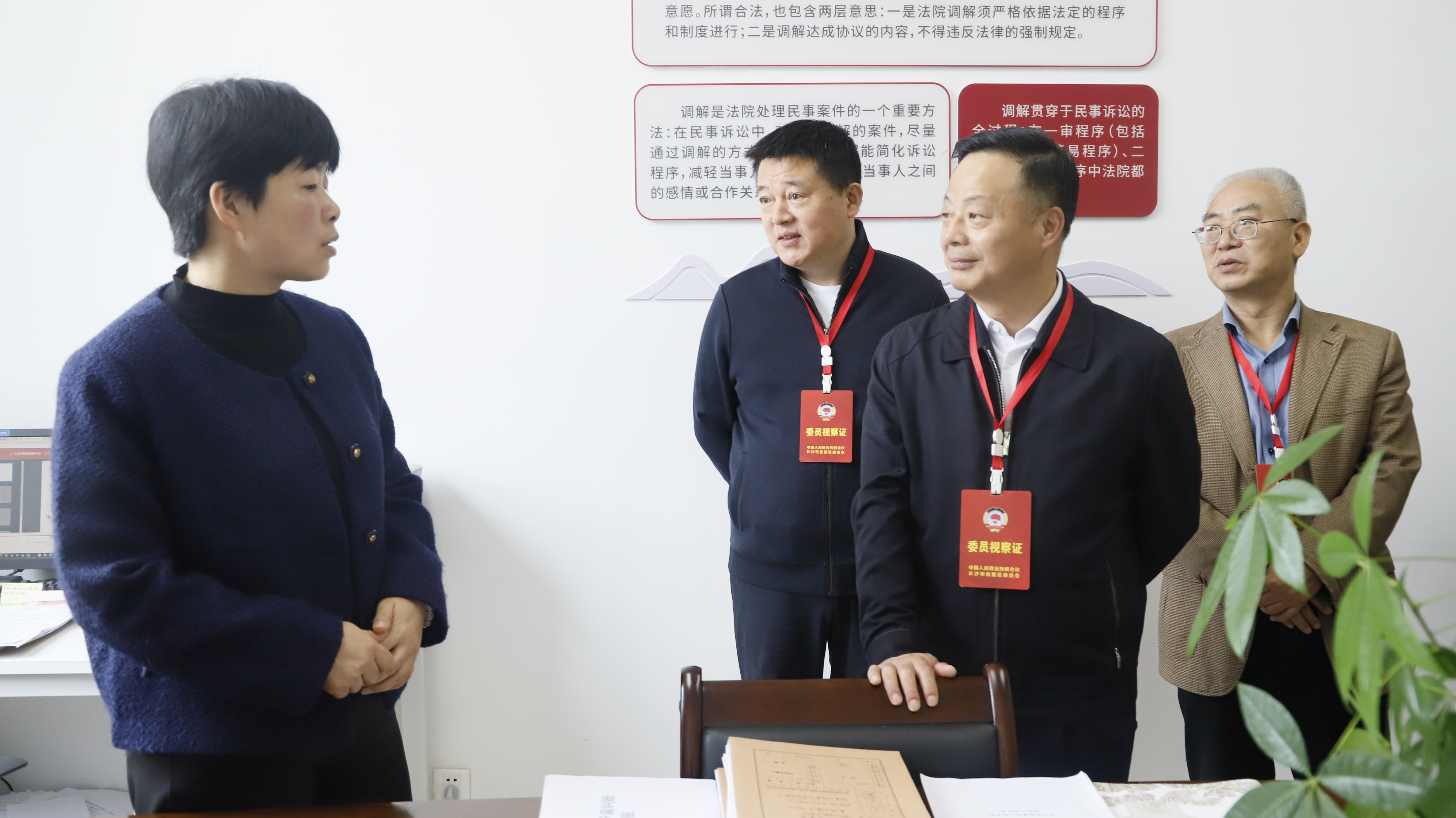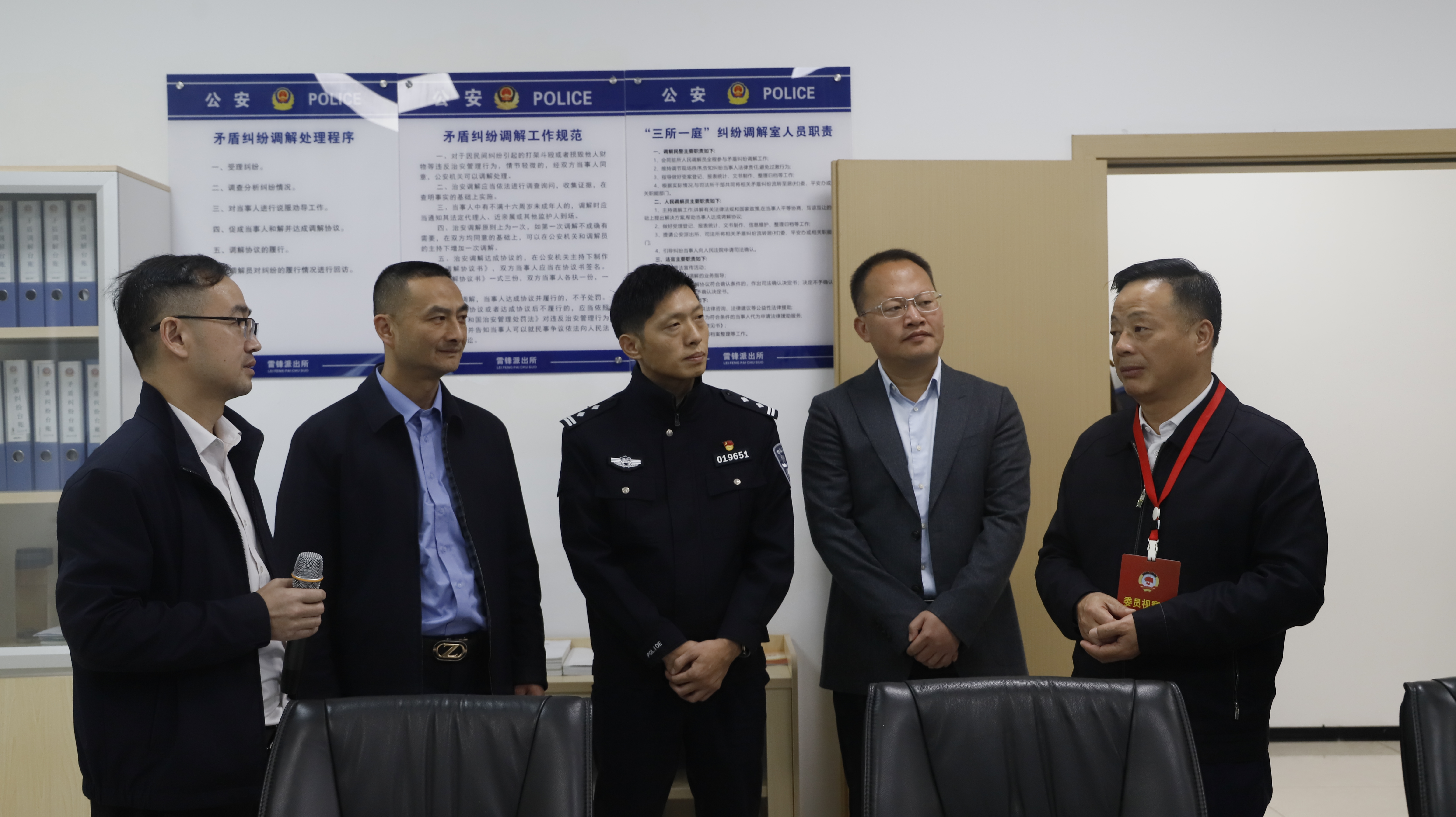 在莲花镇,视察组深入莲花派出所、莲花人民法庭,实地调研“三所一庭”运行情况,并与法庭特邀调解员刘丹深入交流,详细了解辖区矛盾纠纷主要类型、调解力量保障及特色调解举措。