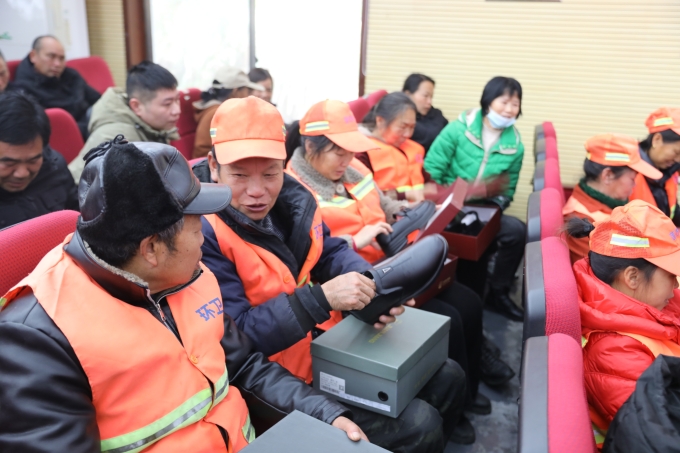 活动末尾,领导和爱心企业代表为120名环卫工人发放了棉皮鞋等暖心慰问物资。
