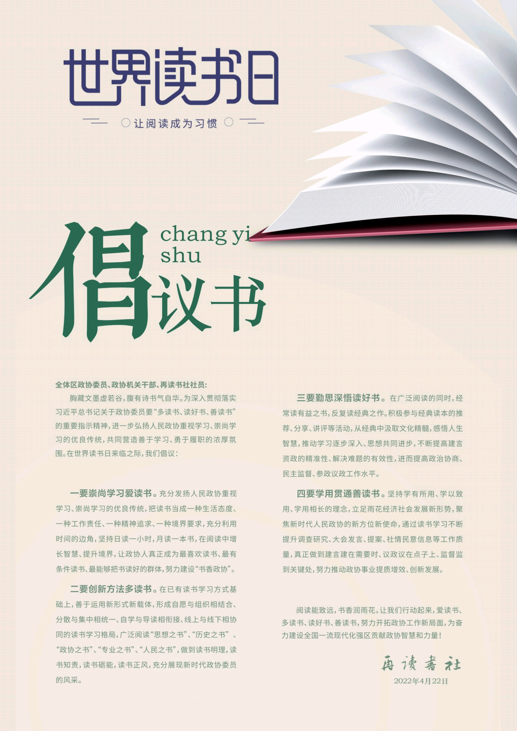 胸藏文墨虚若谷,腹有诗书气自华。为深入贯彻落实习近平总书记关于政协委员要“多读书、读好书、善读书”的重要指示精神,进一步弘扬人民政协重视学习、崇尚学习的优良传统,共同营造善于学习、勇于履职的浓厚氛围。在世界读书日来临之际,我们倡议: