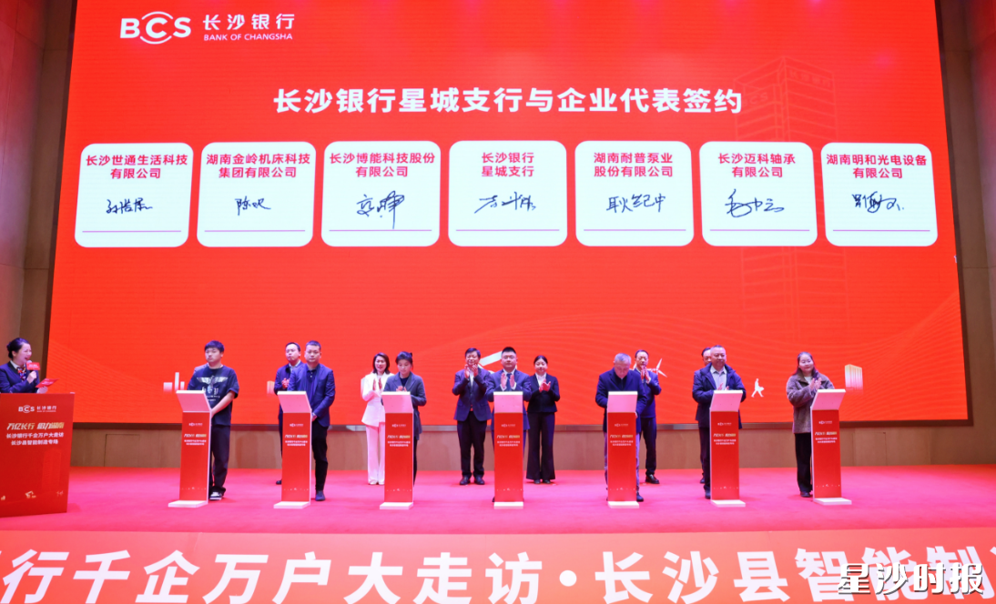 活动现场,长沙银行带来了金融宣讲,详细介绍针对智能制造产业的产品和服务。签约环节中,长沙县人民政府、长沙经开区管委会与长沙银行达成战略合作。长沙银行星城支行与航天凯天环保、湖南汽车制造等12家企业代表签约,开启银企合作新篇章。