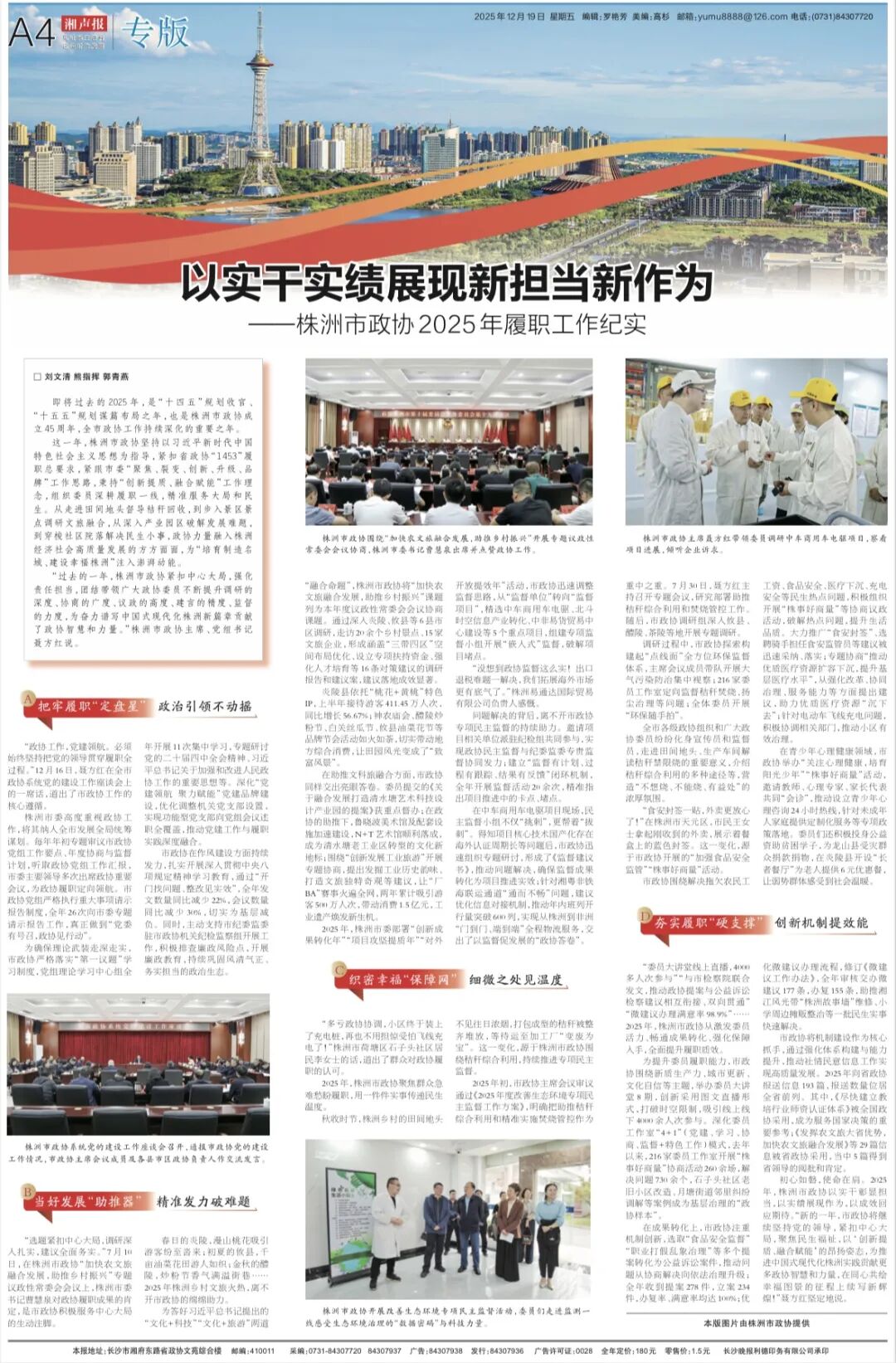 以实干实绩展现新担当新作为 ——株洲市政协2025年履职工作纪实 即将过去的2025年,是“十四五”规划收官、“十五五”规划谋篇布局之年,也是株洲市政协成立45周年,全市政协工作持续深化的重要之年。 这一年,株洲市政协坚持以习近平新时代中国特色社会主义思想为指导,紧扣省政协“1453”履职总要求,紧跟市委“聚焦、裂变、创新、升级、品牌”工作思路,秉持“创新提质、融合赋能”工作理念,组织委员深耕履职一线,精准服务大局和民生。从走进田间地头督导秸秆回收,到步入景区景点调研文旅融合,从深入产业园区破解发展难题,到穿梭社区院落解决民生小事,政协力量融入株洲经济社会高质量发展的方方面面,为“培育制造名城、建设幸福株洲”注入澎湃动能。 “过去的一年,株洲市政协紧扣中心大局,强化责任担当,团结带领广大政协委员不断提升调研的深度、协商的广度、议政的高度、建言的精度、监督的力度,为奋力谱写中国式现代化株洲新篇章贡献了政协智慧和力量。”株洲市政协主席、党组书记聂方红说。 把牢履职“定盘星” 政治引领不动摇 “政协工作,党建领航。必须始终坚持把党的领导贯穿履职全过程。”12月16日,聂方红在全市政协系统党的建设工作座谈会上的一席话,道出了市政协工作的核心遵循。 株洲市政协系统党的建设工作座谈会召开,通报市政协党的建设工作情况,市政协主席会议成员及各县市区政协负责人作交流发言。 株洲市委高度重视政协工作,将其纳入全市发展全局统筹谋划。每年年初专题审议市政协党组工作要点、年度协商与监督计划,听取政协党组工作汇报,市委主要领导多次出席政协重要会议,为政协履职定向领航。市政协党组严格执行重大事项请示报告制度,全年26次向市委专题请示报告工作,真正做到“党委有号召,政协见行动”。 为确保理论武装走深走实,市政协严格落实“第一议题”学习制度,党组理论学习中心组全年开展11次集中学习,专题研讨党的二十届四中全会精神、习近平总书记关于加强和改进人民政协工作的重要思想等。深化“党建领航 聚力赋能”党建品牌建设,优化调整机关党支部设置,实现功能型党支部向党组会议述职全覆盖,推动党建工作与履职实践深度融合。 市政协在作风建设方面持续发力,扎实开展深入贯彻中央八项规定精神学习教育,通过“开门找问题、整改见实效”,全年发文数量同比减少22%,会议数量同比减少30%,切实为基层减负。同时,主动支持市纪委监委驻市政协机关纪检监察组开展工作,积极排查廉政风险点,开展廉政教育,持续巩固风清气正、务实担当的政治生态。 当好发展“助推器” 精准发力破难题 “选题紧扣中心大局,调研深入扎实,建议全面务实。”7月10日,在株洲市政协“加快农文旅融合发展,助推乡村振兴”专题议政性常委会会议上,株洲市委书记曹慧泉对政协履职成果的肯定,是市政协积极服务中心大局的生动注脚。 株洲市政协围绕“加快农文旅融合发展,助推乡村振兴”开展专题议政性常委会会议协商,株洲市委书记曹慧泉出席并点赞政协工作。 春日的炎陵,漫山桃花吸引游客纷至沓来;初夏的攸县,千亩油菜花田游人如织;金秋的醴陵,炒粉节香气满溢街巷……2025年株洲乡村文旅火热,离不开市政协的绵绵助力。 为答好习近平总书记提出的“文化+科技”“文化+旅游”两道“融合命题”,株洲市政协将“加快农文旅融合发展,助推乡村振兴”课题列为本年度议政性常委会会议协商课题。通过深入炎陵、攸县等6县市区调研,走访20余个乡村景点、15家文旅企业,形成涵盖“三带四区”空间布局优化、设立专项扶持资金、强化人才培育等16条对策建议的调研报告和建议案,建议落地成效显著。 炎陵县依托“桃花+黄桃”特色IP,上半年接待游客411.45万人次,同比增长56.67%;神农庙会、醴陵炒粉节、白关丝瓜节、攸县油菜花节等品牌节会活动如火如荼,切实带动地方综合消费,让田园风光变成了“致富风景”。 在助推文科旅融合方面,市政协同样交出亮眼答卷。委员提交的《关于融合发展打造清水塘艺术科技设计产业园的提案》获重点督办;在政协的助推下,鲁晓波美术馆及配套设施加速建设,N+T艺术馆顺利落成,成为清水塘老工业区转型的文化新地标;围绕“创新发展工业旅游”开展专题协商,提出发掘工业历史韵味、打造文旅独特奇观等建议,让“厂BA”赛事火遍全网,两年累计吸引游客500万人次,带动消费1.5亿元,工业遗产焕发新生机。 2025年,株洲市委部署“创新成果转化年”“项目攻坚提质年”“对外开放提效年”活动,市政协迅速调整监督思路,从“监督单位”转向“监督项目”,精选中车商用车电驱、北斗时空信息产业转化、中非易货贸易中心建设等5个重点项目,组建专项监督小组开展“嵌入式”监督,破解项目堵点。 “没想到政协监督这么实!出口退税难题一解决,我们拓展海外市场更有底气了。”株洲易通达国际贸易有限公司负责人感慨。 问题解决的背后,离不开市政协专项民主监督的持续助力。邀请项目相关单位派驻纪检组共同参与,实现政协民主监督与纪委监委专责监督协同发力;建立“监督有计划、过程有跟踪、结果有反馈”闭环机制,全年开展监督活动20余次,精准指出项目推进中的卡点、堵点。 株洲市政协主席聂方红带领委员调研中