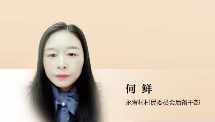 作为永青村村民委员会后备干部,何鲜爱岗敬业,尽职尽责。她严谨务实地完成村部文书档案整理工作;在乡村振兴一线,她走村串户摸排情况,主动为群众解决实际问题。她不忘政协委员初心,结对帮扶三户特殊对象,尽力帮助解决实际困难。生活中她低调和善、孝敬公婆、友善乡邻,以良好品德赢得了群众的广泛信任与好评。
